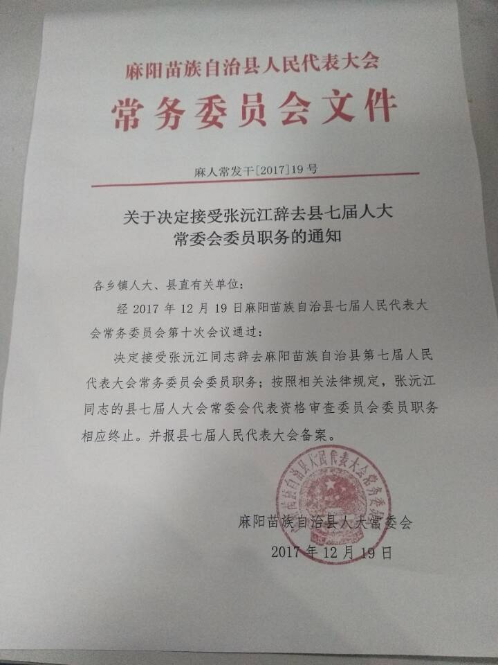 关于决定接受张沅江辞去县七届人大常委会委员职务的通知 麻阳苗族自治县门户网站 www.qzzjl.com 发布时间:2017-12-19 19:29 【字体:大 小】 分享到: 打印正文 来源:县人大常委会 作者: 相关信息 上一篇:关于田华等的决定任免通知 [ 2017-12-13 ] 下一篇:关于龙永杰等的任命通知 [ 2017-12-28 ]